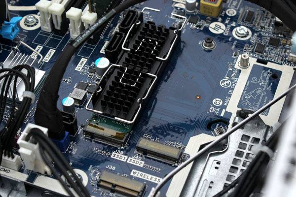아랫쪽에는 무선랜(Wi-Fi) 및 블루투스(Bluetooth) 기능을 제공할 수 있는 무선 네트워크 카드 장착이 가능한 M.2 2230 WLAN (PCIe 3.0 x1 + Intel CNVi) 슬롯이 마련되어 있다.