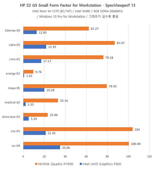 워크스테이션에서 많이 쓰이는 CAD/CAM 성능을 알아보기 위해 Specviewperf 벤치마크를 돌려봤다. 인텔 제온 W-1270에 들어간 인텔 UHD 그래픽 P630 내장 그래픽으로는 3D 그래픽 관련 애플리케이션을 돌리기 버거운 상태지만, 엔비디아 쿼드로 P1000 외장 그래픽 카드를 통해 처리 성능을 높여 프로 레벨의 그래픽 작업을 할 수 있다. 물론 전문적인 렌더링 작업 머신으로는 SFF 타입보다 타워형 고사양 Z PC가 필요할 것으로 생각된다.