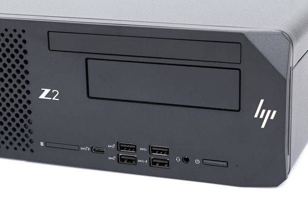 HP Z2 G5 SFF 전면은 디자인을 중시하는 요즘 PC 케이스에서 쓰지 않는 슬림 ODD 베이나 외부 3.5인치 베이 등 워크스테이션 환경에서 레거시 장비를 사용할 수 있게 설계됐으며 SD 카드 리더기도 옵션으로 선택 가능하다.