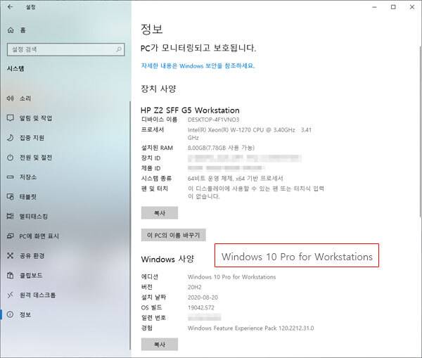 하지만 소형 폼 팩터 워크스테이션을 표방하는 HP Z2 G5 SFF에는 그냥 윈도우 10 프로 버전이 아닌 워크스테이션을 위한 버전이 설치되어 있다. 마이크로소프트에 따르면 워크스테이션용 윈도우 10 프로 버전에는 고급 워크로드 또는 데이터 요구 사항을 가진 사용자를 위해 설계됐다고 한다. 하드웨어 지원에서도 최대 6TB 메모리와 4개의 CPU로 구성된 고성능 시스템을 지원한다.