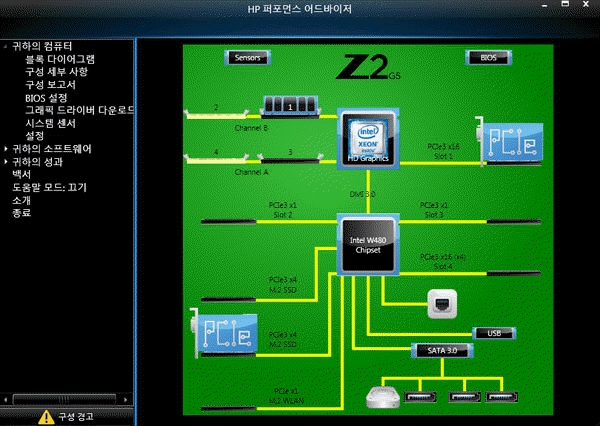 HP 퍼포먼스 어드바이저(HP Performance Advisor)는 사용자에게 HP Z2 G5 SFF 시스템의 구성과 세부 사항, 바이오스 설정, 그래픽카드 정보 및 드라이버 다운로드, 시스템 센서 정보 등 전반적인 시스템 상태를 한 눈에 파악하고 신규 드라이버를 빠르게 다운로드 받아 설치하도록 도와준다.