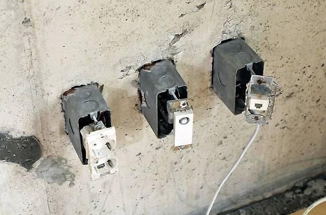 기존 전선과 분전반_ 지은 지 20년이 넘는 건물을 리모델링한다면, 모든 전선을 새로 설치하는 게 좋다. 전선도 노후화되기 때문이며, 리모델링 후엔 이를 다시 할 수도 없다.