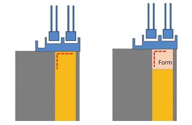 [그림 1]처럼 20~25㎜ 두께의 결로 방지 단열재를 시공할 때, 구조체와 일체 타설할 경우 철근 배근부터 시작해 많은 것을 고려해야 한다. 이것이 싫어 후부착하면 마감 시 다른 곳과 단 차가 생길 수밖에 없다. 그런데 이와 유사한 제품을 사용할 경우 [그림 2]처럼 석고보드 마감과 두께를 같이할 수 있어 작업이 편하다.
