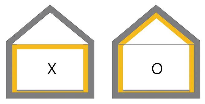 경사지붕일 때, 평천장에 단열재를 추가하는 것은 옳은 방법이 아니다. 평천장과 경사면 사이에 빈 공간이 있는데 벽면에 단열재를 붙일 때 바탕 면과 단열재 사이에 빈 공간이 없도록 노력하는 것을 이해한다면, 이 방식은 공간 속에 곰팡이를 기르는 것과 같다. 평천장의 단열재 때문에 공간의 온도가 매우 심하게 내려가고, 그 공간으로 실내 습기가 침투하는 것이 곰팡이 생성의 원인이다. 그러므로 천장을 드러내고 경사면에 단열을 추가하는 것이 맞다. 이때 주의사항은 외벽 단열재를 시공하는 것과 같으며, 특히 전등의 전선을 처리할 때 조심해야 한다. 물론, 외벽에 글라스울 단열재 시공과 마찬가지로 실내 측에 방습층이 있을 경우 공간을 둬도 되지만, 기존 주택의 일반적인 상황을 고려할 때 평천장에 방습층을 완전히 만드는 것은 불가능하다.