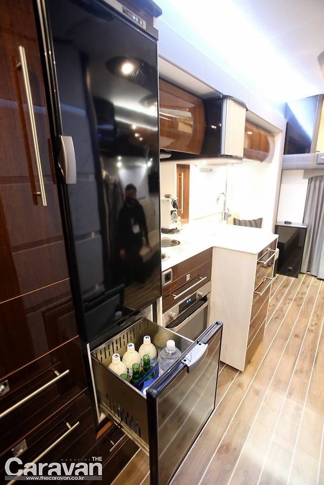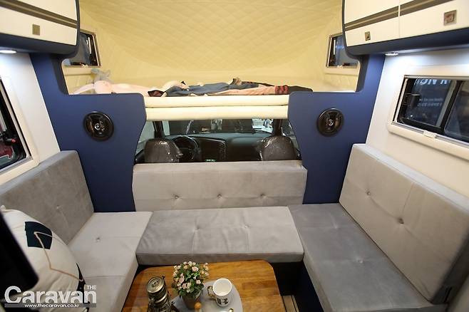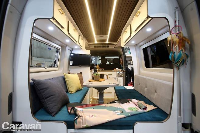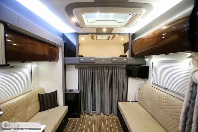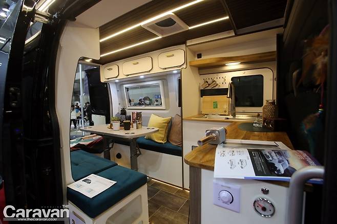 확장형 캠핑카의 실내로 들어서본다. 첫 인상은 제일모빌 아씨에 캠핑카와 비슷한 인상을 받게 된다. 차별화 포인트로는 요트의 데크를 연상시키는 바닥재와 유럽 캠핑카의 전형적인 라운지 공간을 꼽을 수 있다.