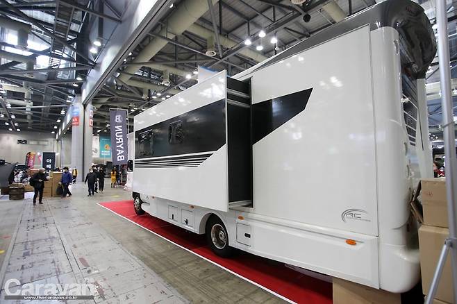 이베코 베이스로 제작된 확장형 캠핑카. 안그래도 넓고 큰 모델인데 측면 확장을 통해 최대의 생활공간을 제공하고 있다.