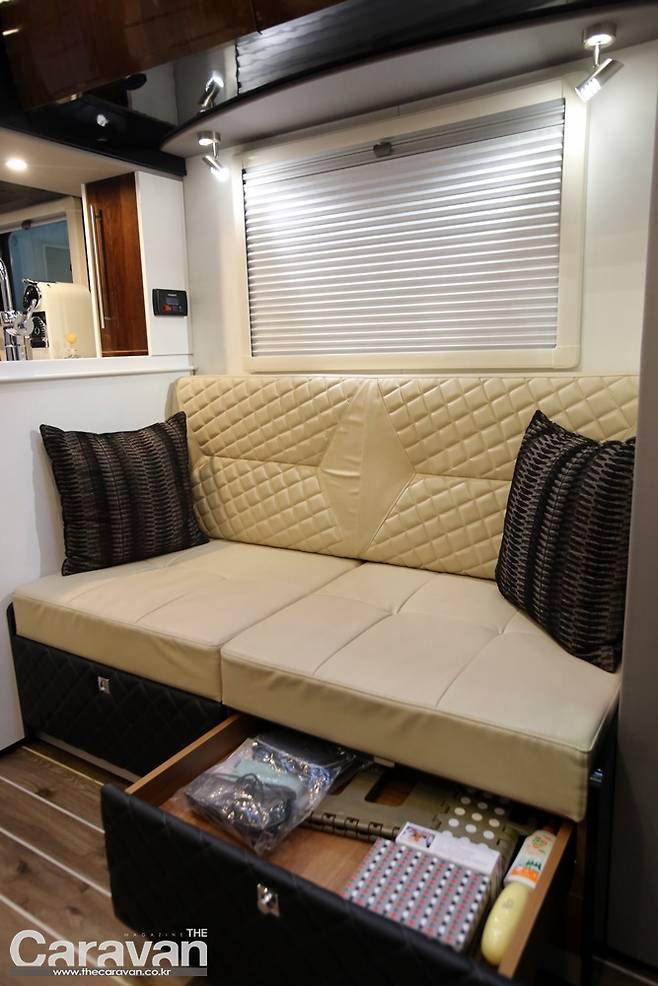 전면부 라운지는 운전석과 동반석으로 이어지는 구조이며 측면 확장 전에는 소파가 중앙에 가깝게 실내 안쪽으로 슬라이딩 된다.