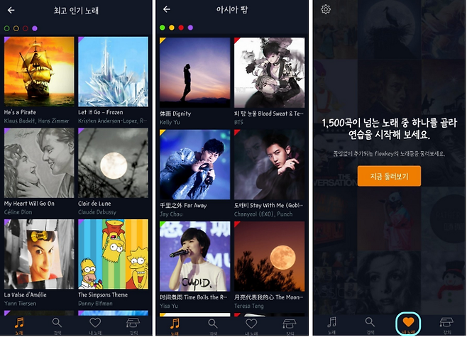 본격적으로 앱을 둘러봤다. 우선 ‘초급’, ‘중급’, ‘상급’, ‘프로’로 나뉜 레벨을 선택하면 원곡의 아름다움은 그대로 유지한 채 수준에 맞춘 곡이 제공된다. 초급은 초록, 중급은 노랑, 상급은 빨강, 프로는 보라색으로 표시돼 있는데, 노래 앨범 왼쪽 상단에 색이 조그맣게 표시돼 있어 곡의 수준을 쉽게 가늠할 수 있다.