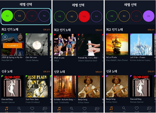 본격적으로 앱을 둘러봤다. 우선 ‘초급’, ‘중급’, ‘상급’, ‘프로’로 나뉜 레벨을 선택하면 원곡의 아름다움은 그대로 유지한 채 수준에 맞춘 곡이 제공된다. 초급은 초록, 중급은 노랑, 상급은 빨강, 프로는 보라색으로 표시돼 있는데, 노래 앨범 왼쪽 상단에 색이 조그맣게 표시돼 있어 곡의 수준을 쉽게 가늠할 수 있다.