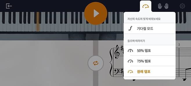 원래 템포는 그 곡을 처음 접하는 사람에게 당연히 어려울 수밖에 없다. 이 앱은 원래 속도는 물론이고, 50%, 75% 템포로 속도를 조절하여 연습할 수 있다는 장점이 있다. 아울러 기다림 모드는 맞는 음을 칠 때까지 악보를 넘기지 않고 기다려주는 기능이다. 설치된 기기의 마이크를 활성화하거나 MIDI 연결을 하면 사용자가 연주하는 음을 감지하여 정확하게 칠 수 있도록 도와준다.