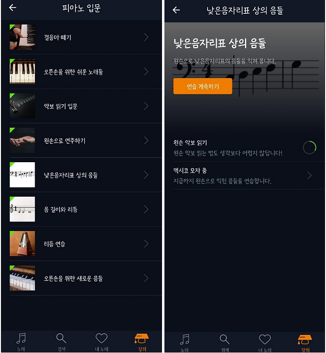 피아노를 오랫동안 치지 않았거나 처음 접하는 등 바로 곡을 연주하기 부담스러운 실력이라면 강의를 통해 기본을 다진 후 연주를 본격적으로 시작하는 것도 좋은 방법이다. 피아노 이론, 악보 읽기, 코드 익히기까지 다양한 레슨 콘텐츠를 활용할 수 있어 한결 수월하게 노래를 연주할 수 있도록 도와준다.