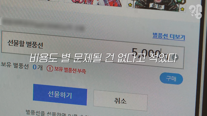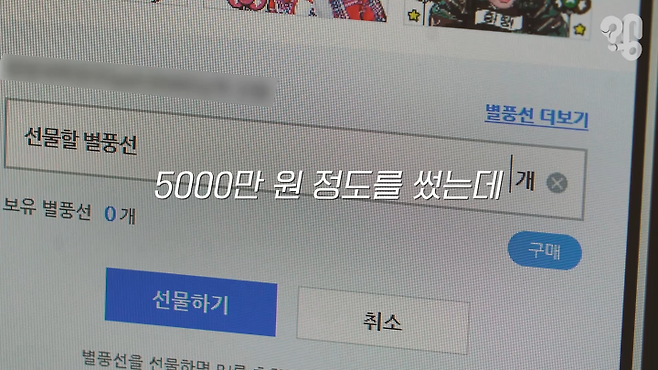 또 다른 아프리카TV 열혈팬 B씨와도 통화했는데 그는 작년 한 해 동안 별풍선 500만 개 정도를 쐈다고 했다.
