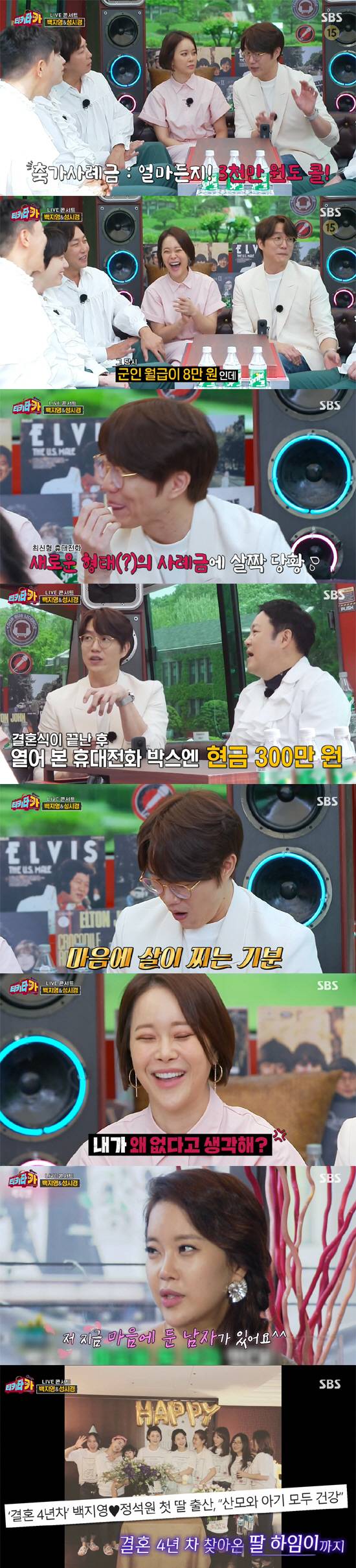또 "백지영 누나 축가를 내가 부른다는 걸 기사보고 알았다. 아무리 친해도 이건 얘기는 해줘야하지 않나 생각했다"고 토로했다. 이에 백지영은 "난 얘기한 줄 알았다. 두달만에 결혼준비를 해야하는데 남편이 지방 촬영을 가서 정신이 없었다. 내가 성시경의 '두사람'을 너무 좋아한다. 또 멘트가 툭 던지는 것 같으면서도 사람 마음을 따뜻하게 해준다"고 칭찬했다.