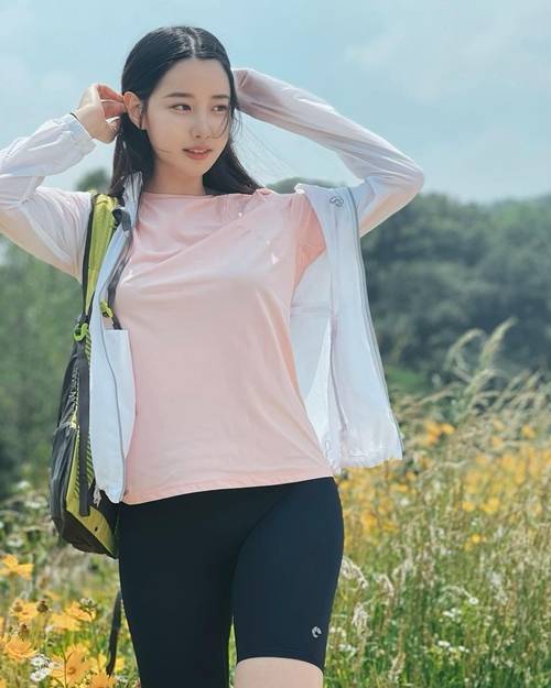 공개된 사진 속 조현은 흰색 방풍 재킷과 핑크색 셔츠, 검은색 반바지 레깅스를 매치했다. 긴 생머리의 조현은 여신 미모에 넘치는 건강미를 자랑한다.