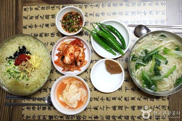 누른 국수라는 이름은 다소 생소하지만, 쉽게 말해 경상도식 칼국수라고 보면 된다. 밀가루에 콩가루를 섞어 얇고 넓게 밀어낸 반죽이 특징으로, 면발이 잘 넘어가는 식감이 독특한 대구의 향토음식이다. 사골육수가 아닌 멸치와 다시마를 기본으로 낸 육수가 시원하면서도 진한 맛을 내고, 국수를 다 먹은 뒤에는 뜨끈한 국물에 말아서 먹을 수 있도록 상차림에 보리밥이 함께 나온다.