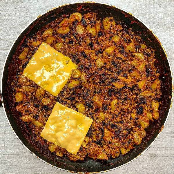 떡볶이를 먹고 나면 늘 남는 떡볶이 양념. 버리긴 아깝고 그렇다고 양념만 먹기 그렇다면 볶음밥을 만들어보자. 남은 떡볶이 양념에 밥을 볶아 먹는 것으로 탄생된 떢볶이 볶음밥 레시피는 편의점조합 중에서 손꼽히는 특급 레시피다. 먼저 떡볶이 제품을 조리예에 따라 준비한다. 떡볶이 떡은 1cm 두께로 썰어 주는 것이 좋다. 그다음 전자렌지에 햇반을 데운다. 준비한 떡볶이에 햇반을 넣고 마구 섞어준다. 김 가루를 잘게 부셔 넣는다. 달군 팬에 떡볶이 볶음밥을 올리고 팬에 넓게 고루 편다. 그 위에 슬라이스 치즈 2~3장을 올린다. 볶음밥이 꼬들꼬들하니 바삭하게 익도록 꾹꾹 눌러준다. 치즈가 어느 정도 녹으면 깨를 뿌려 완성한다.