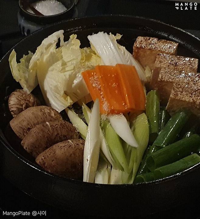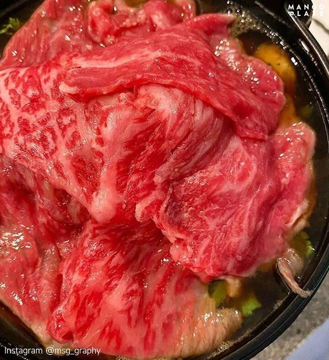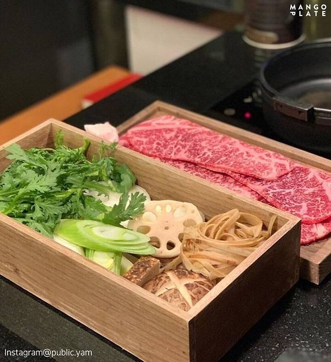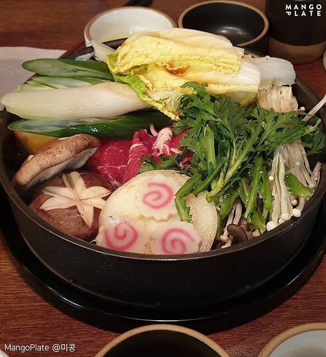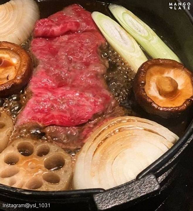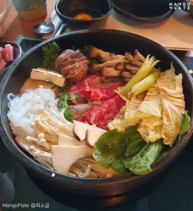 이곳은 조리 전 소기름과 버터 중 하나를 선택해 기름칠을 해주시는데요. 여기에 야채와 고기를 넣고 한냄비의 쯔유 소스와 육수를 부어 입맛에 알맞게 간을 조절해주시면 돼요. 채소의 단맛이 육수에 배었을 때 국물 한 입 뜨면 '캬' 소리가 나오는 절로 나오는 맛이랍니다. 채소와 육수는 추가로 요청하실 수 있어요.