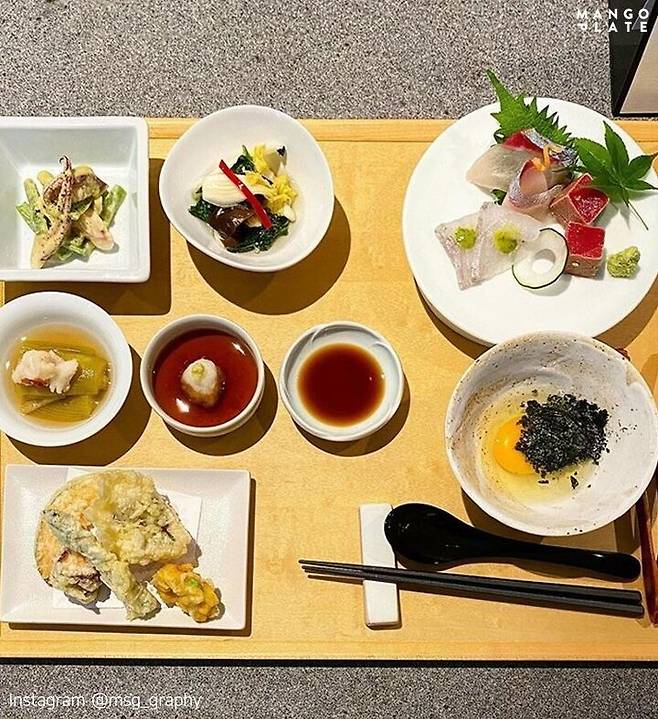 런치로 방문 시 위와 같은 한 상이 준비되는데요. 제철 식재료들을 이용한 다채로운 소요리와 생선회, 튀김, 그리고 갓 지은 솥밥으로 이루어져 있어요. 디너 코스 역시 계절감이 가미된 개성 있는 일본 요리들로 구성되어 있답니다.