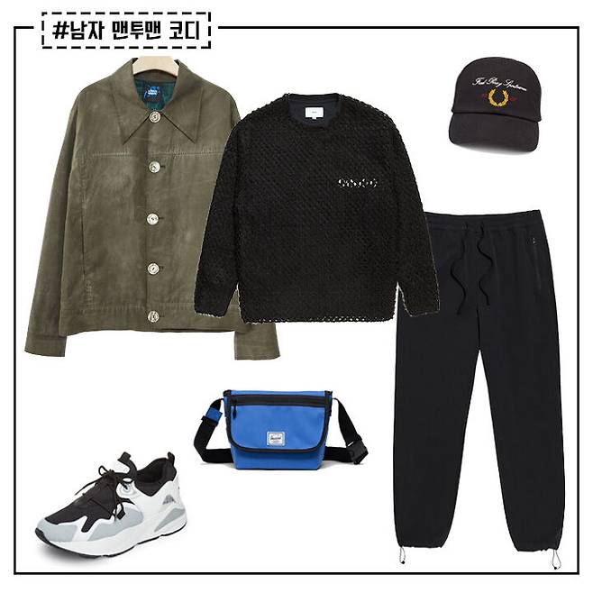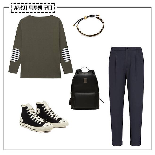 블랙 컬러의 맨투맨과 뉴트럴톤의 카키 컬러감의