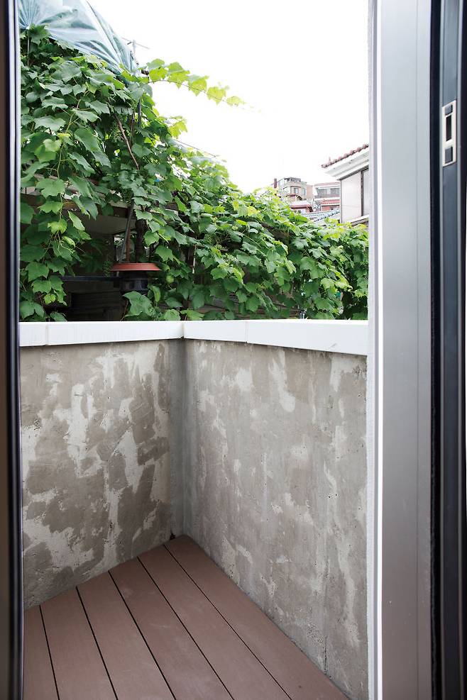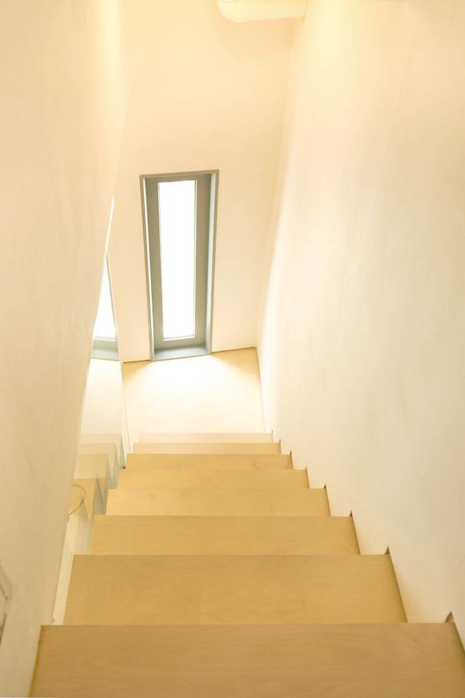 1층 작업실은 바닥을 최대로 사용해 5.57평의 면적으로 계획하고, 2층(식당/주방·거실)과 3층(침실)에 각각 4.75평의 공간을 올렸다. 작은 대지에 3층으로 설계한 이유다. 2층에 1.5평의 작은 테라스도 생겼다.
