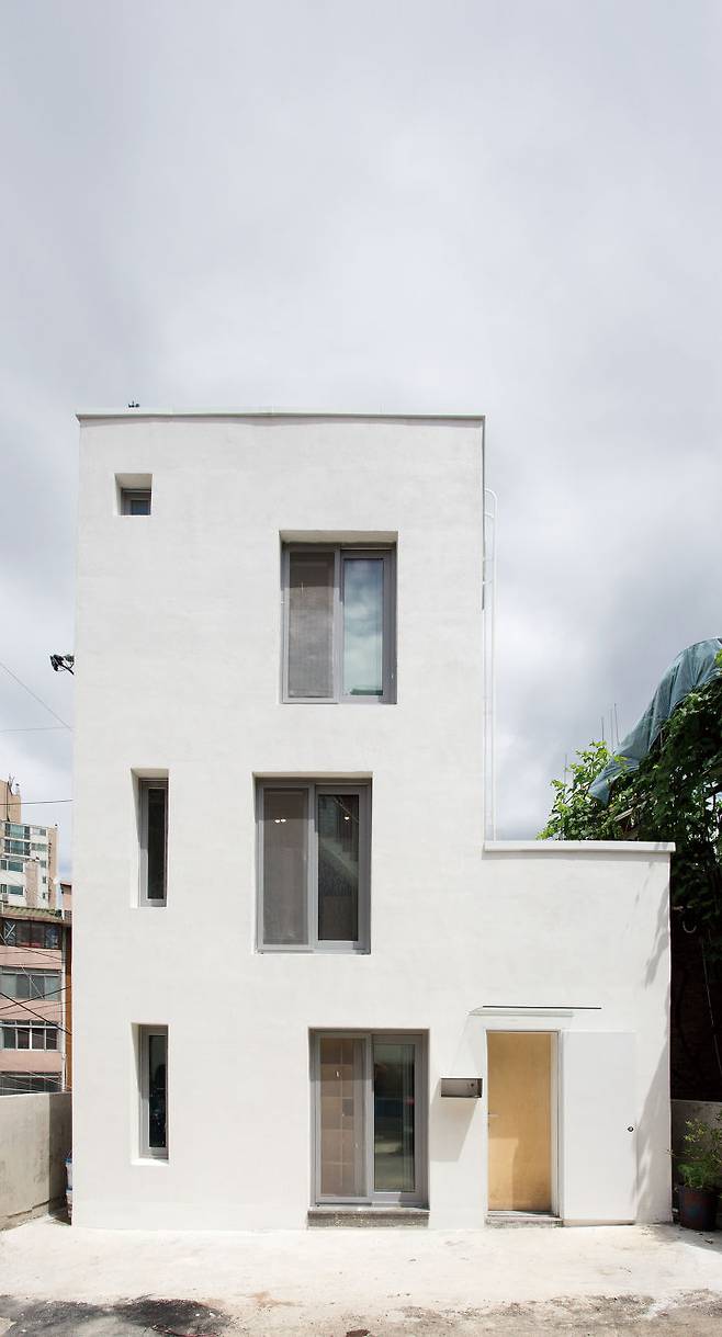 외부에서 바라보이는 입면은 최대한 단순하게 계획했다. 오염에 강한 흰색 세라믹 페인트와 유리를 주로 사용하고, 도로 측에서 보이는 북측에 프라이버시를 고려해 기능적으로 꼭 필요한 작은 창문들만 냈다. 의도한 것은 아니지만, 북측 면은 사람의 얼굴과 같은 입면이 되어, 지나가는 사람들에게 재미있는 인상을 주고 있다.