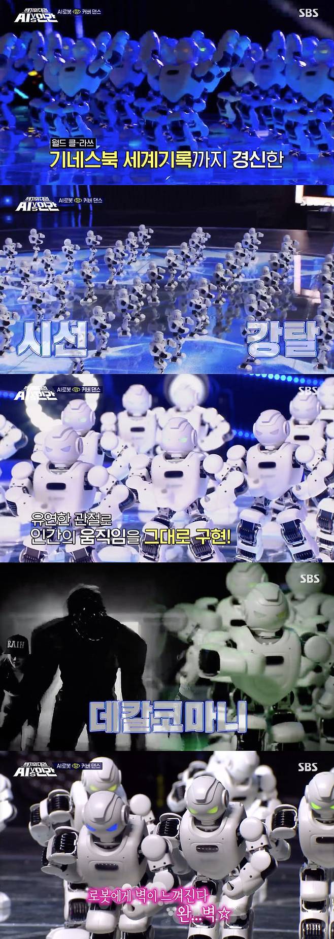 이날 방송에서는 AI 로봇 70대가 비의 '깡' 커버 댄스를 선보였다. 유연한 관절로 인간의 움직임을 그대로 재현한 AI 로봇은 고난도 스핀까지 완벽하게 소화해 감탄을 자아냈다. 비와 데칼코마니 수준의 AI 로봇의 군무는 시선을 사로잡기에 충분했다.