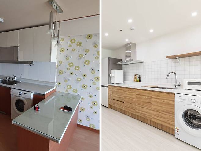 새롭게 꾸며진 20평 인테리어의 주방은 카페 같은 거실 콘셉트가 어울리는 모습을 갖추었는데요. 상부장을 없애 벽면의 여유면적을 확보하고 우드 선반을 시공해 장식과 수납이 가능하도록 연출하였습니다.