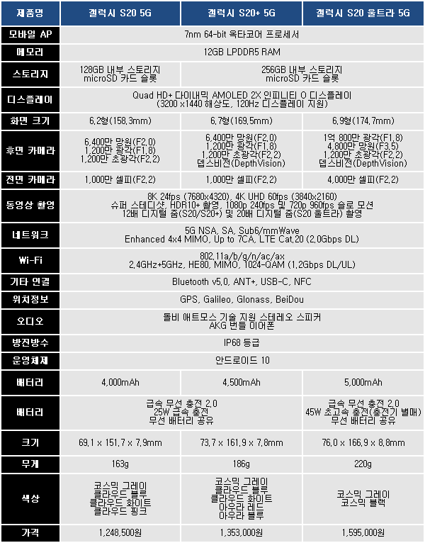 지난 해에도 갤럭시 S10(노멀)과 S10+(대화면), 그리고 5G 전용까지 3가지 모델을 발표했던 삼성전자는 올해 공개한 갤럭시 S20 시리즈도 S20, S20+, 그리고 1억 800만 화소 카메라를 탑재한 S20 울트라의 3종류로 꾸몄다.