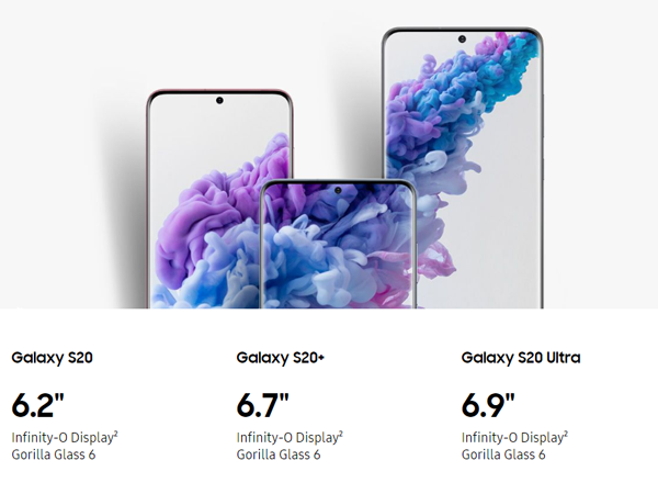 갤럭시 S20은 6.2형(158.3mm), 갤럭시 S20+는 6.7형(169.5mm), 갤럭시 S20 울트라는 6.9형(174.7mm) 화면 크기를 가졌지만, S20 시리즈 모두 Quad HD+ Dynamic AMOLED 2X 기반 인피티니 O 디스플레이가 들어가고, 3200 x 1440 해상도와 120Hz 디스플레이를 지원하는 점은 같다.