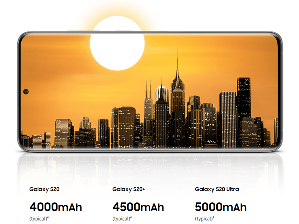 또한, 대용량 배터리를 탑재하고 급속 충전을 지원해 하루 종일 배터리 걱정 없이 사용할 수 있다. 배터리 용량은 갤럭시 S20이 4,000mAh, 갤럭시 S20+가 4,500mAh, 갤럭시 S20 울트라가 5,000mAh로 화면이 커지면서 배터리도 늘렸다.