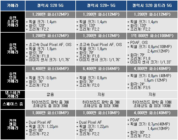 그러나 세부적인 내용을 살펴보면 갤럭시 S20 및 S20+는 여전히 1,200만 화소 광각 카메라를 메인으로 쓰고 갤럭시 S20 울트라만 1억 800만 화소 광각 카메라를 메인으로 바꿨다. 초광각 카메라 화소수는 오히려 1,600만 화소에서 1,200만 화소로 떨어졌다.
