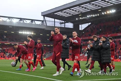 epa09223550 Liverpool players greet the supporters after the English Premier League soccer match between Liverpool FC and Crystal Palace in Liverpool, Britain, 23 May 2021. EPA/Paul Ellis / POOL EDITORIAL USE ONLY. No use with unauthorized audio, video, data, fixture lists, club/league logos or 'live' services. Online in-match use limited to 120 images, no video emulation. No use in betting, games or single club/league/player publications.