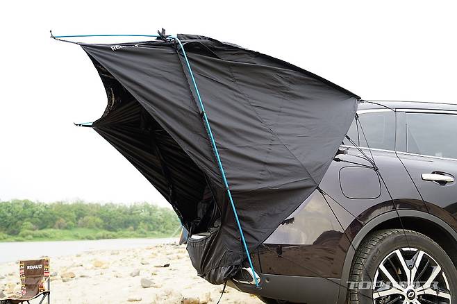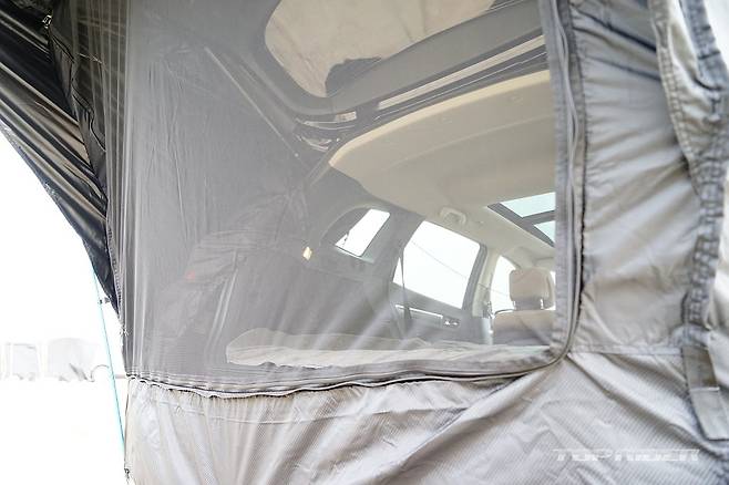 돗자리 만한 커버에서 텐트를 꺼내 트렁크를 연 상태로 올리고, 먼저 상단 고정 줄을 1열 시트에 연결한 후, 나머지 고정 줄은 리어 휠에 둘둘 감아 마무리하면 된다. 폴대는 총 3개로 직관적으로 끼울 수 있는 구조다. 트렁크를 연 상태로 모기장만 닫으면 그늘까지 완성된다.