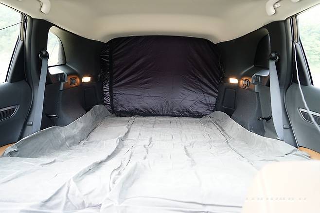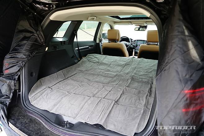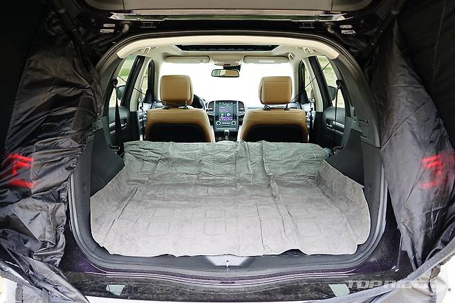 전용 에어매트는 트렁크 입구부터 폴딩된 2열까지 실내 바닥을 완전히 커버한다. QM6의 폴딩시 실내 길이는 175cm 전후의 성인이 완전히 몸을 편 상태로 누울 수 있는 수준이다. 몸을 구부리지 않고 잠을 청할 수 있는, 성인 차박이 가능한 마지노선에 가까운 공간이다.
