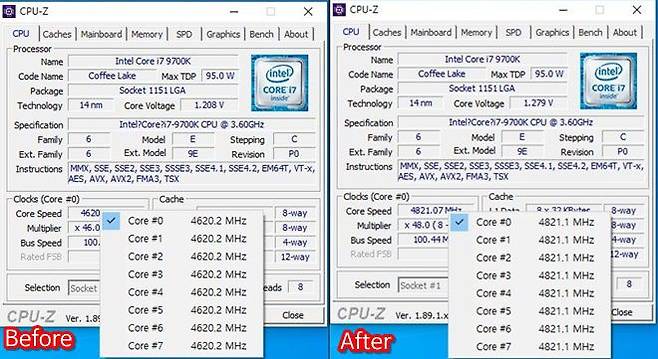 이는 부스트클럭처럼 일부가 코어가 아닌 올코어 대상으로 늘어난 부분이기 때문에, 실제로 약간의 부하를 준뒤에 클럭을 체크해보면, 모든 코어의 클럭이 최대 4.6GHz 에서 4.8GHz까지 상승하는 모습을 확인할 수 있어 오버클러킹이 성공했음을 알 수 있다.