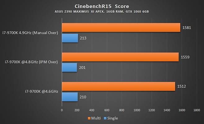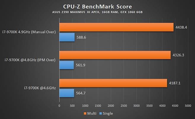 케이벤치에서 IPM 테스트는 i7-9700K와 ASUS Z390 ROG 막시무스 XI APEX 메인보드를 활용했으며 커세어 2열 수냉 H115i 수냉 쿨링 환경을 이용했다.