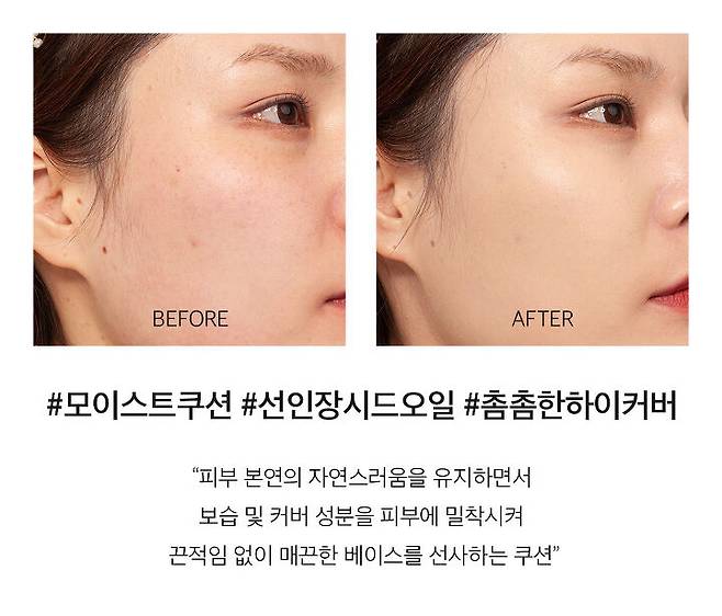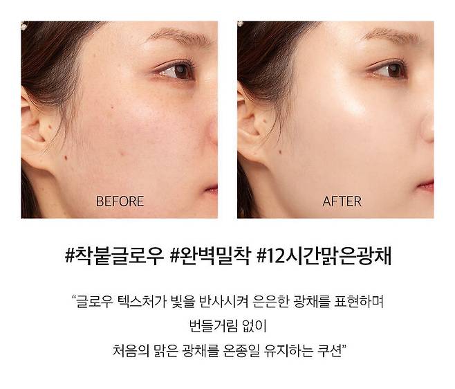 에스쁘아의 프로 테일러 비 글로우 쿠션은 민낯이라고 말할 수 있을 정도로 자연스럽게 커버됐어요. 높은 커버력보다는자연스럽게 톤 보정 및 광채를 선사해주는 쿠션이에요. 들뜨는 것 없이 내 피부처럼 밀착되고 얇게 도포돼서 사용감이 아주 좋았어요. 땅김 없는 적당한 수분감과 피부 톤을 잡아주는 화사한 쉐이드라 톤 보정이 필요한 피부가 쓰면 좋을 것 같아요. 에디터처럼 홍조가 심한 피부는 속살의 붉은기가 여전히 올라오기 때문에 컨실러를 함께 쓰는 걸 추천해요.
