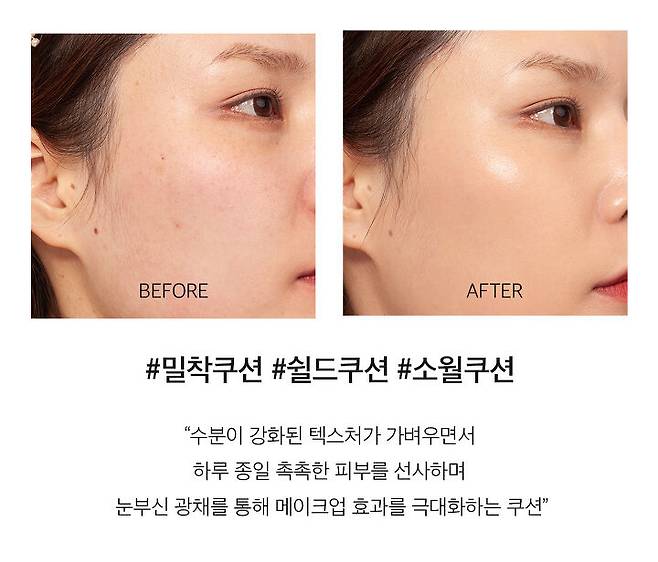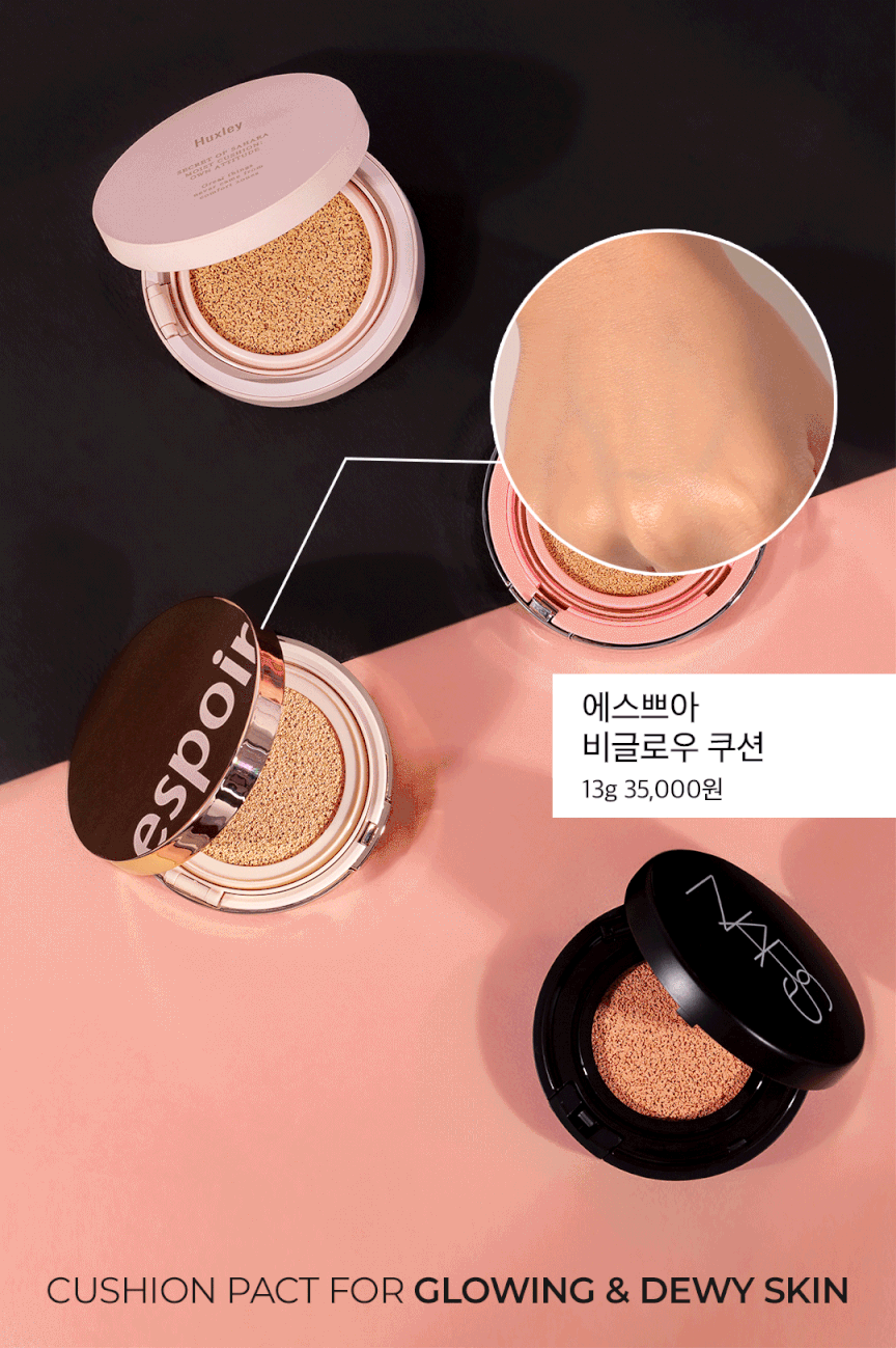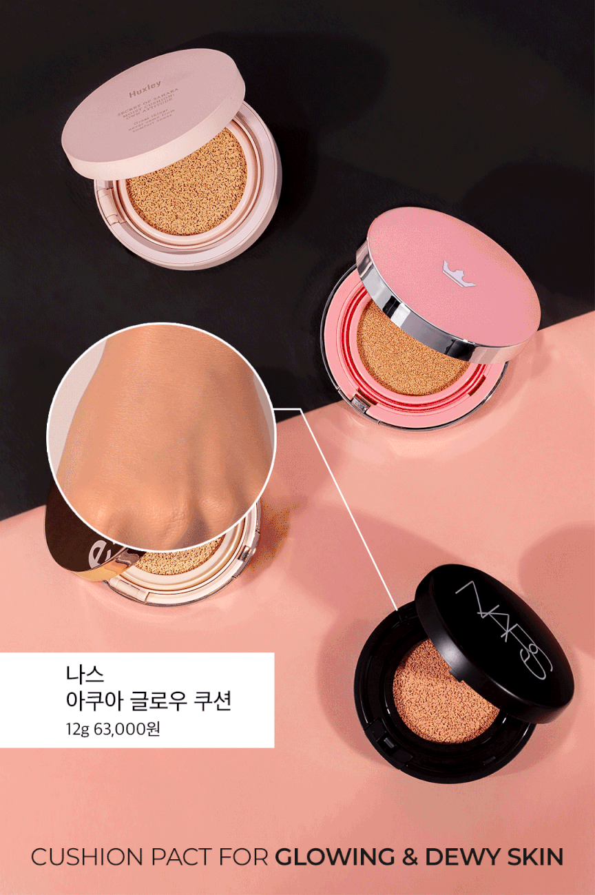 나스의 아쿠아 글로우 쿠션 파운데이션은 촉촉한 제형인 게 눈에 보일 정도로 수분감이 가득해서 균일하게 커버하기 굉장히 편하더고요.핑크 톤의 밝은 컬러인 소월을 발랐는데 에디터 피부 톤에는 어두워서 톤업 효과는 느끼지 못했지만 커버력이 높은 편이라 쿠션만으로 홍조와 잡티까지 모두 가릴 수 있었어요.사용감이 굉장히 가볍고 글로우 텍스처만의 광채 표현 덕분에 피부가 건강해 보여요. 화사하게 보정하기 보다 잡티 없이 건강하고 반짝이는 피부 표현을 원하시는 분께 추천해요.