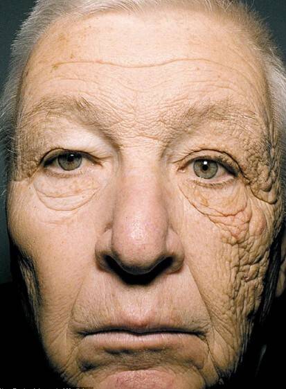 햇살에 직접 노출된 한쪽 얼굴만 주름진 것을