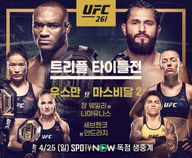 UFC 261은 25일 오전 7시부터 언더카드와 메인카드 모두 스포티비 나우(SPOTV NOW)와 스포티비 온(SPOTV ON)에서 볼 수 있다.
