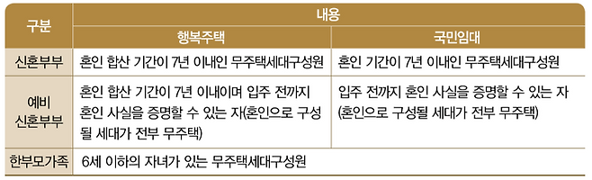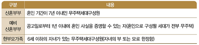 : 취약계층(사업 지구 철거민 등/ 장애인 등/ 3자녀 이상/ 국가유공자 등/ 영구임대입주자 등) 및 신혼부부