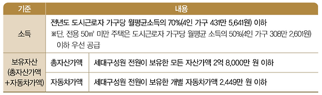 - 입주자 모집 공고일 현재 무주택 세대주 및 세대원으로 아래의 소득 및 자산보유기준을 충족하는 자