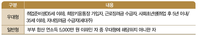 : 전용면적 85㎡ 이하(수도권 제외 읍면 지역은 100㎡ 이하), 5억 원 이하 ※ 단, 만 30세 이상 단독세대주는 60㎡ 이하, 3억 원 이하 주택