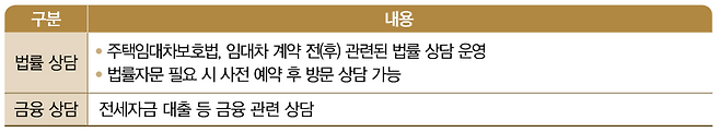 - 주택 전월세 이용 시 발생하는 법률·금융 상담 제공