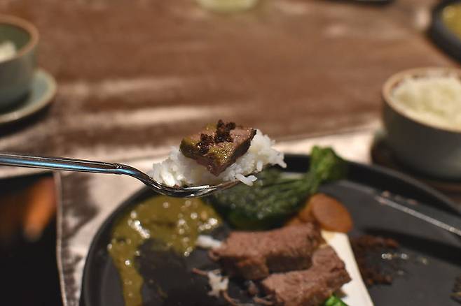 곡물사료 소고기가 마블링이 좋다고 하여 스테이크 정도를 생각했지만 슬로 쿡 방식으로 조리해서 그런지 기름기도 없고 살짝 보쌈 같이 부드러웠달까? 일행 중 한 명은 '국거리'라고 표현하기도 했어요.