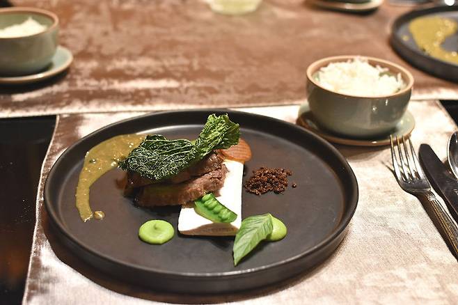곡물 사료를 먹여서 키운 호주산 소고기, 그린빈 포테이토 퓌레, 바질, 사보이 양배추, 무짠지(무김치) 등의 재료가 인상적이네요.