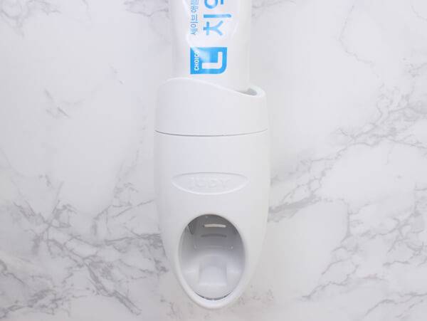 상단에는 치약을 끼울 수 있는 공간이 마련되어 있다. 치약을 고정하는 방법은 아주 간단하다. 치약 뚜껑을 열고, 치약 입구를 구멍에 맞춰 돌려 끼우면 된다.