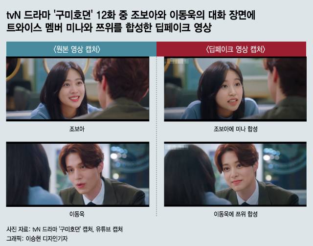 A씨는 유튜브 알고리즘에 걸린 지난해 12월3일 종영한 tvN 드라마 ‘구미호뎐’ 관련 영상을 보다가 깜짝 놀랐다. 썸네일을 보고 두 주연배우 조보아와 이동욱이 대화를 나누는 한 장면인 줄 알고 클릭했는데 화면 속 얼굴은 걸그룹 트와이스 멤버 미나였다. 화면 속 목소리는 조보아였지만 입과 눈썹의 움직임과 눈을 내리까는 표정 등은 그냥 미나다. 마치 미나가 연기하는 것처럼 자연스러웠다. 다시 보니 이동욱인 줄 알았던 남자 배우도 다른 얼굴이었다. 트와이스 멤버 쯔위의 이목구비를 이동욱 얼굴과 합성한 것이었다.