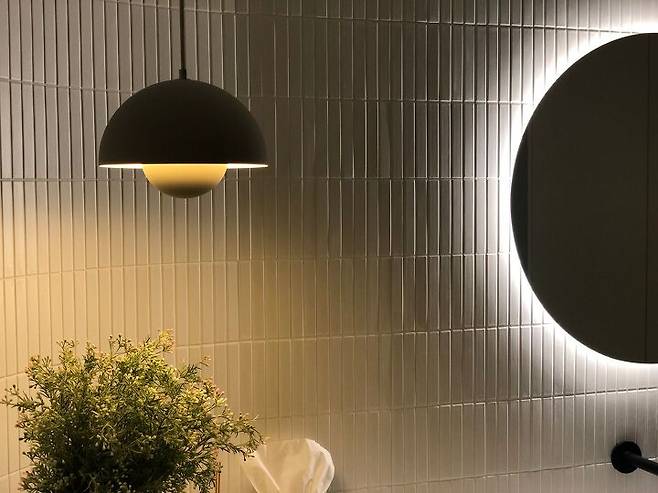 간접 조명만 켜도, 고급진 무드를 연출할 수 있어요. 살다보니 자꾸 소품이 늘어만가네요. 간단한 세면도구를 비치했는데, 아침에 화장할 때 뿐 아니라 외출하고 돌아와서 바로 옷을 갈아입고 손 씻기 참 좋아요.