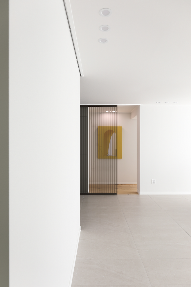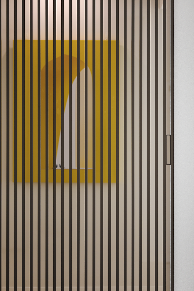 기존의 다크그레이를 모두 떼고, 화사한 느낌을 주는 집으로 변신했어요. 인테리어 전부터 집에 포인트가 될만한 무언가를 원했는데, 거실(공용공간)과 부부침실을 구분하는 매개로 큰 슬라이딩 도어를 달았어요. 길게 쭉 뻗은 간살도어 뒤로 그림과 조명이 비쳐 우아한 느낌을 줍니다.